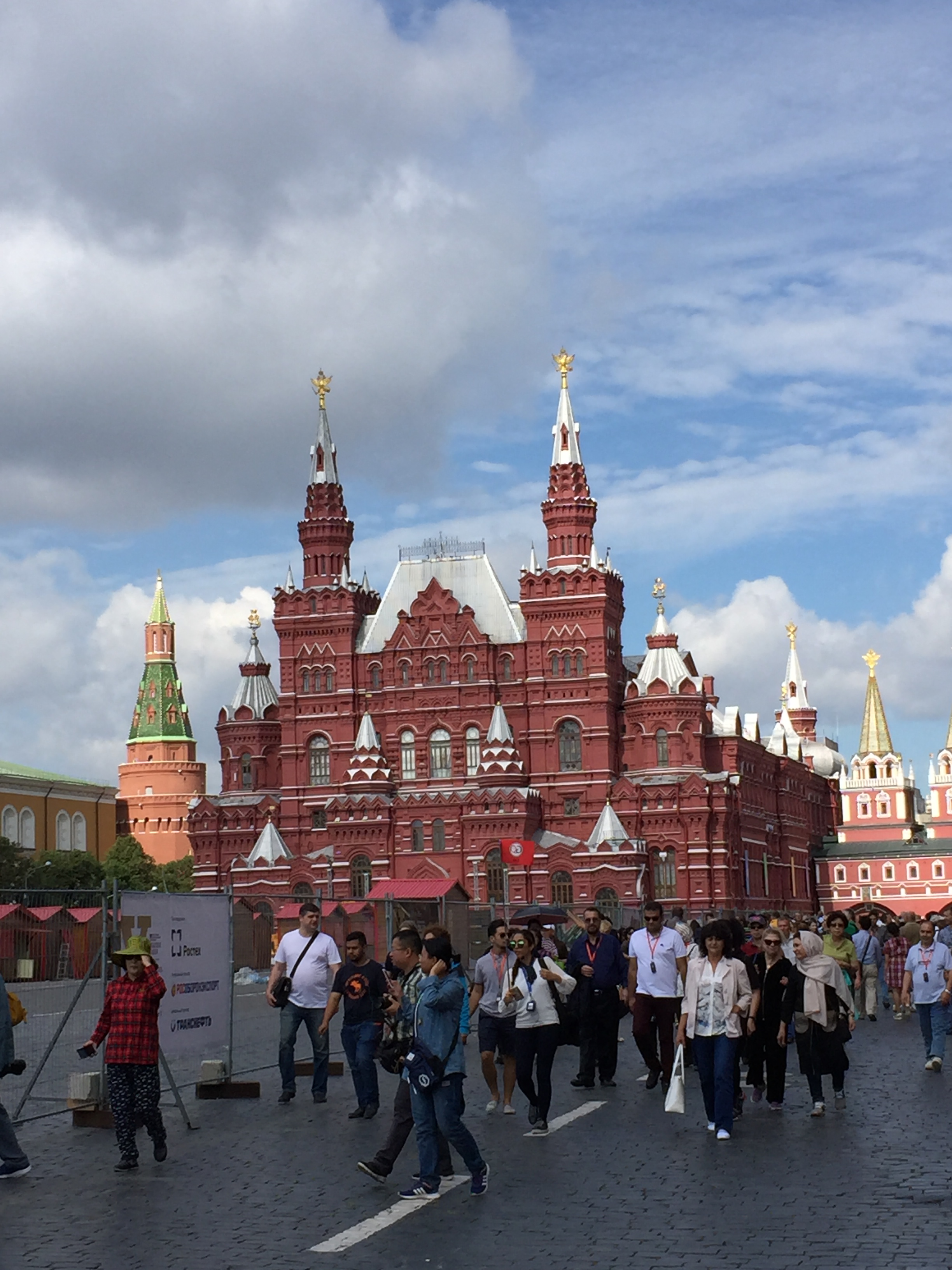 Yo estuve desde el 11 hasta el 17 y menos mal q lo.vi al principio,recién comenzaban los preparativos,el 17 ya estaba fatal gradas altas y techadas,el.kremlim perfecto,san basilio hay q verla desde atrás y la.plaza está todo ocupada y y llena de kioscos de venta,lamfiesta es desfile bandas música entre el 23 y 1 setiembre ,será complicado.